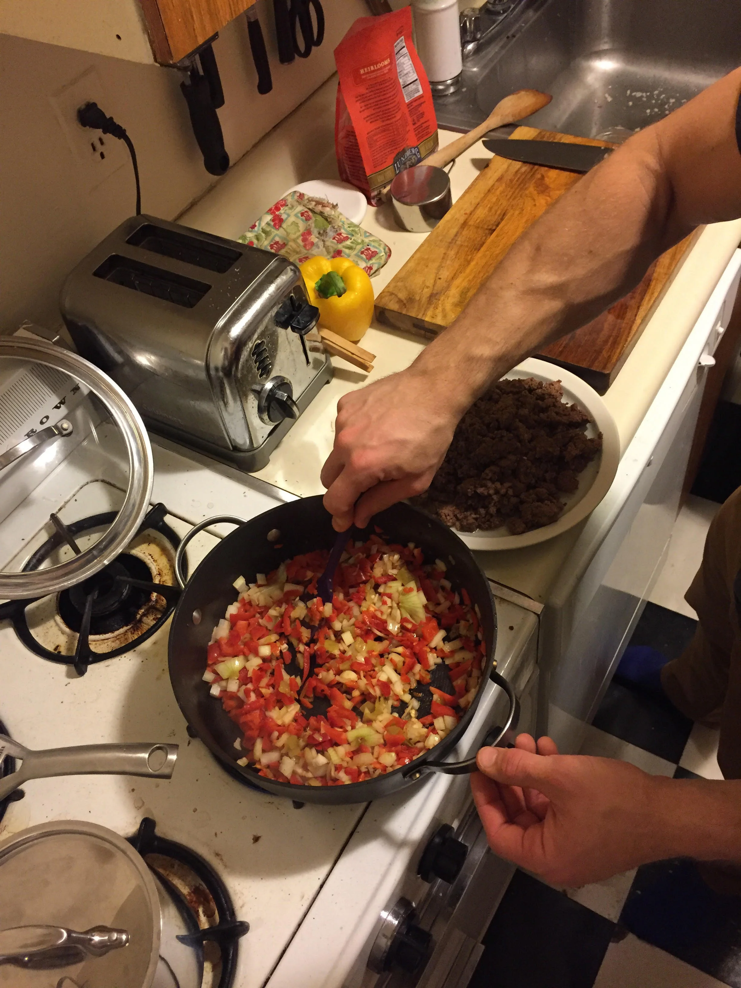 After the mise en place, the rest of the work came together quickly and easy. We put the rice to a simmer, began to braise chicken and then got to work on browning the beef and setting up the chili. Once that was done, we were left with some downtime to discuss training plans, download data and analysis wattage – because what else do cyclists do when they are together??