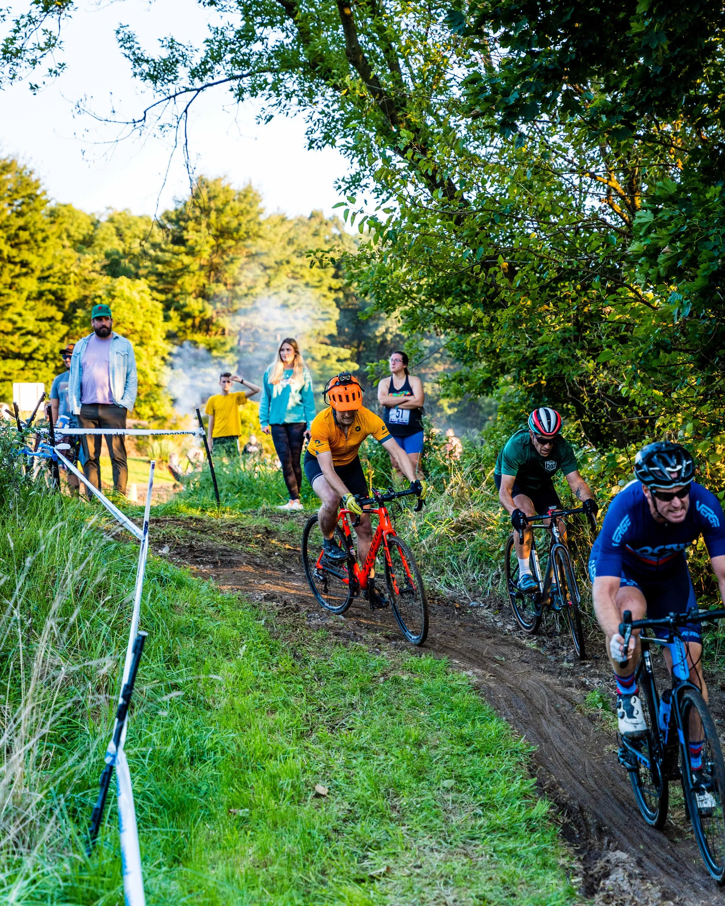 There are three races per night. We start with a cross-country run at 5:45pm. It’s two laps of the course and deemed “5k-ish” as the distance varies each year with the updated course designs. The cyclocross races start at 6:30pm. The first race is 4 laps in the direction of that week’s cross-country run. The second cyclocross race follows a brief refreshment break and is three laps in the opposite direction. We change the first direction each week for variety and because each direction is significantly different in the run and ride dynamics.