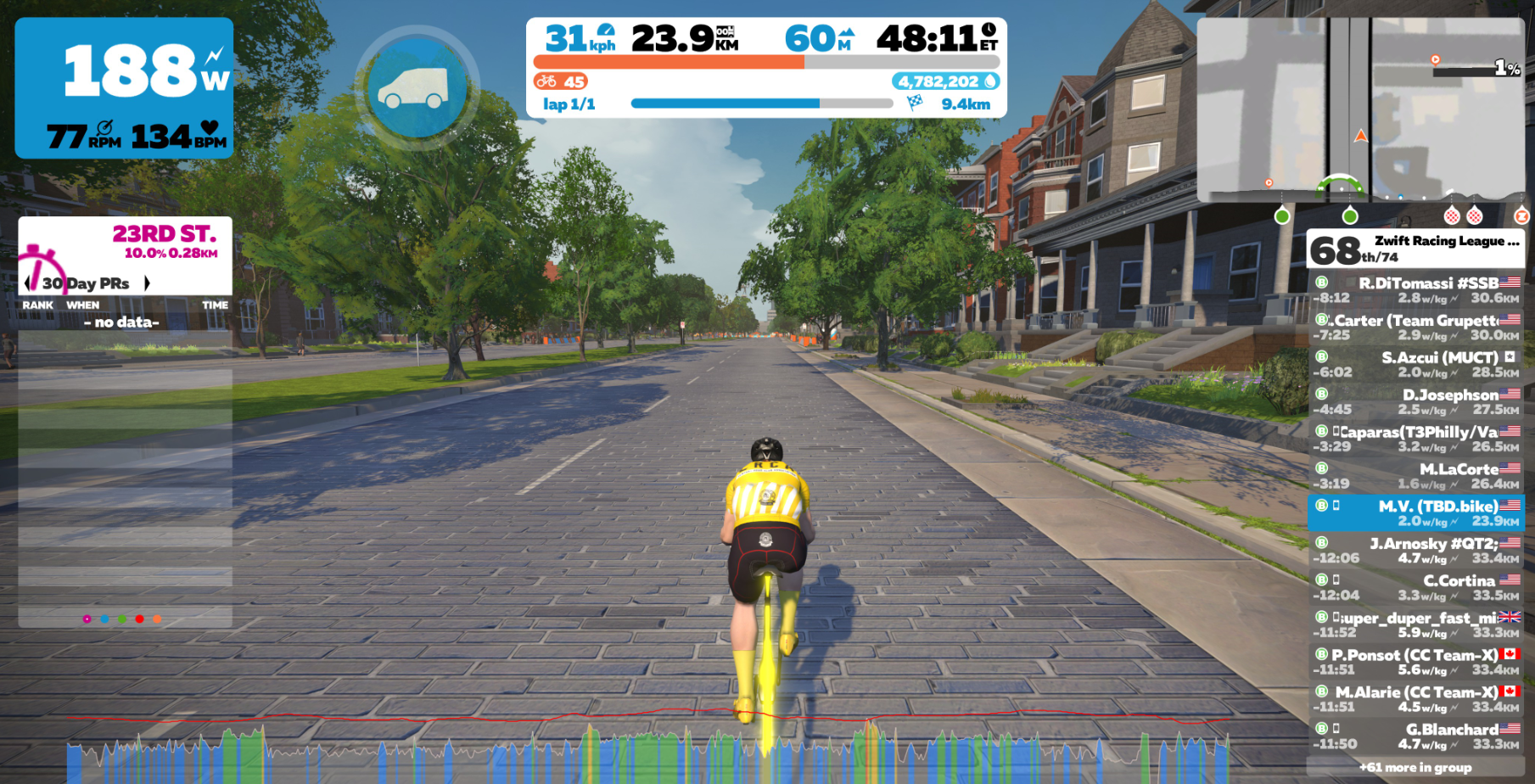 On paper week 7 of ZRL Season 2 was finally my opportunity to shine after several climbing focused courses and some hardware issues kept me from racing the past few weeks. After the break I was more than excited to see last week’s multiple ascents of the Volcano KOM like swapped for 5 intermediate sprints on the mostly flat Libby Hill After Party course… flat sprints are one of the few areas where I excel in the virtual world of Zwift racing.
