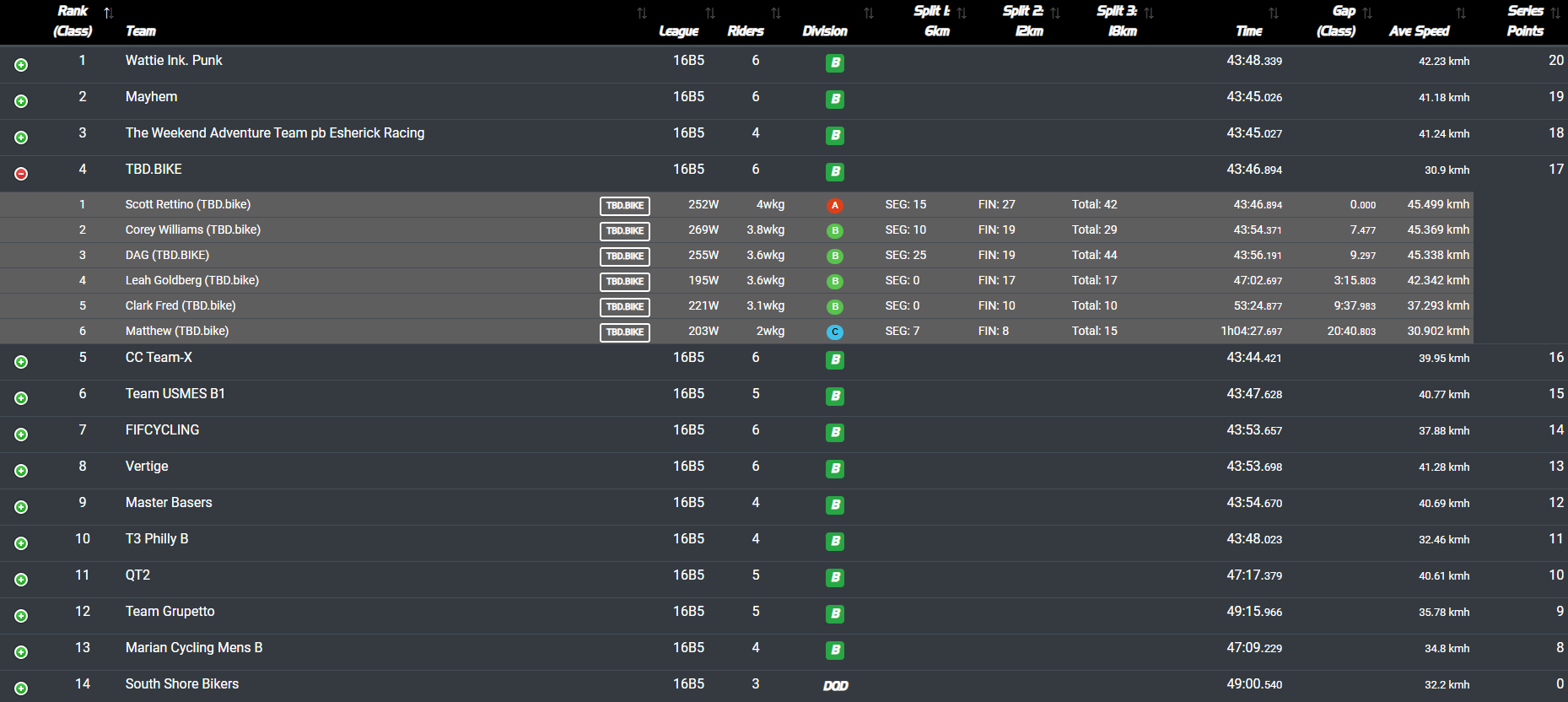While Daghan was the leading scorer on the team, Scott’s hard fought top ten finish up Libby Hill was close behind for another 42 points. And every single rider on the team was in the double digits on the scoreboard even if I finished a full 20 minutes behind the lead group. In total it was sufficient to finally break our streak of 6th place finishes in the road races - just one step off the podium in 4th place in our best result thus far:
