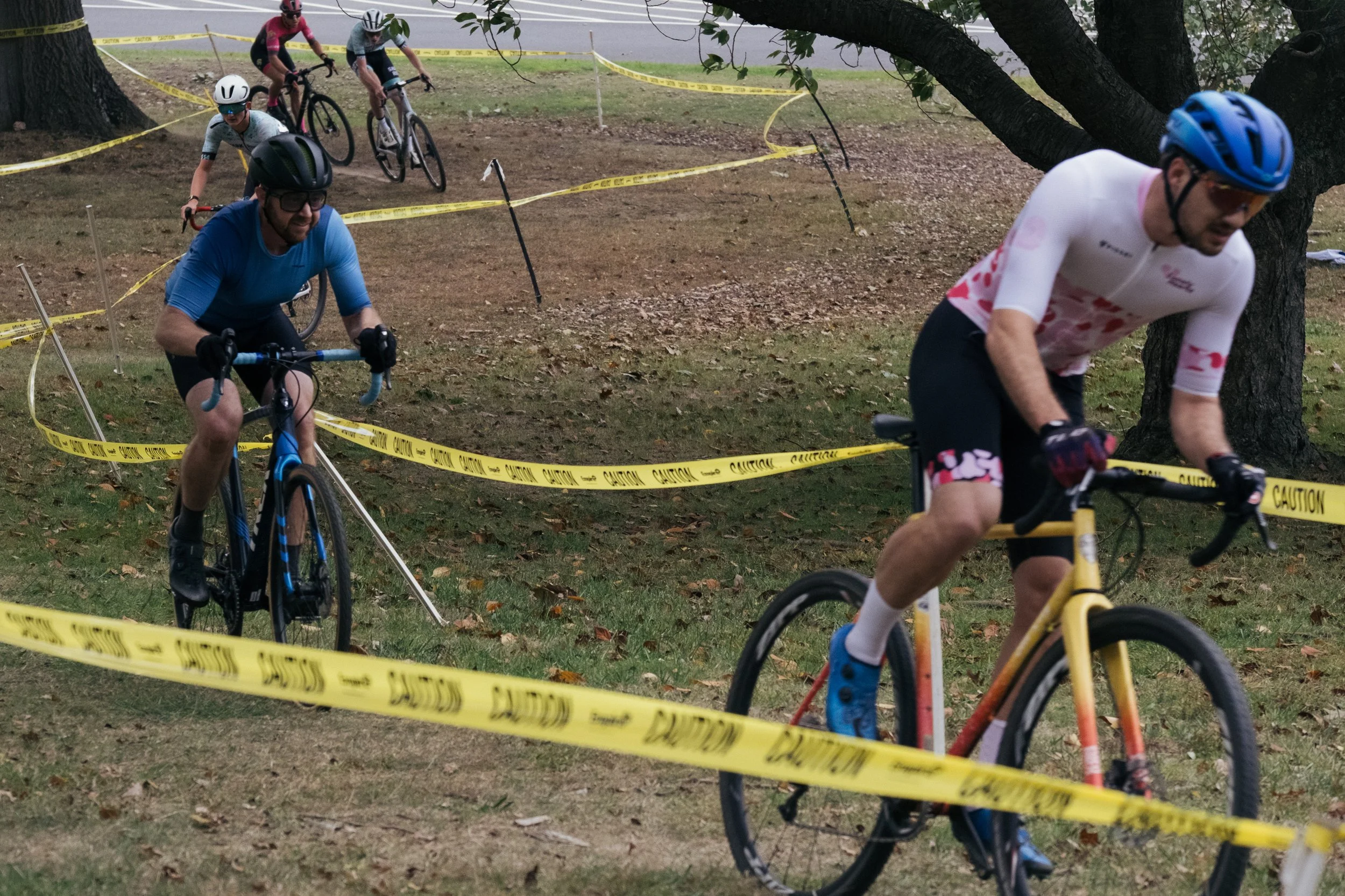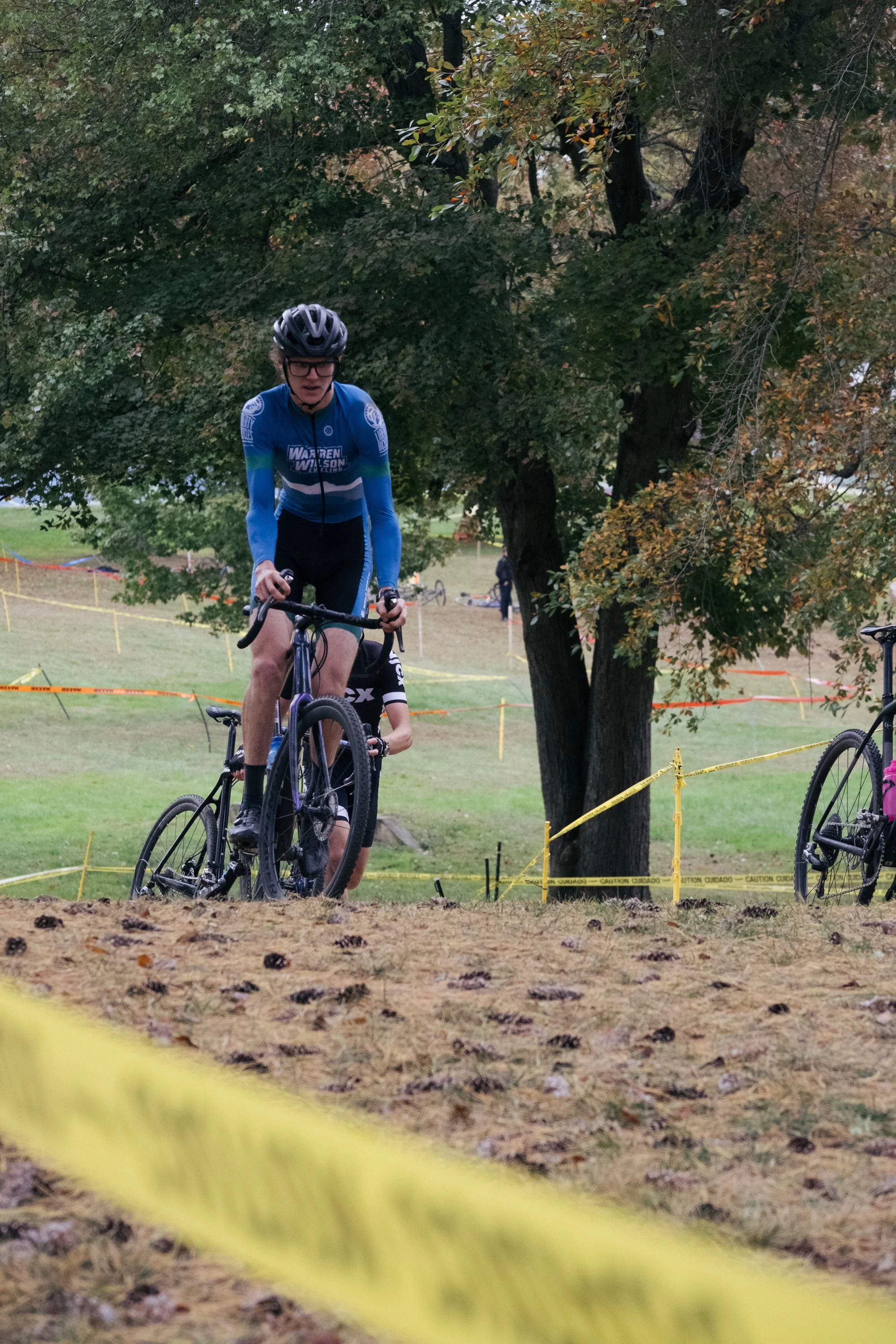 I hit the smooth spot I noted around the bathroom. It keeps the speed up into the first off camber and then navigate the tight corner. More lightly uphill straight and more opportunity to put down power. I take the wide corners with as little brake as possible, then into the next off camber sections. I take this well, and make the turns to the set of barriers on course. My dismount is good, and I'm over them fairly quickly. I find a bit of momentum in my remount. In my previous races, I had no momentum or had to awkwardly clamber back on the pedals with both legs already over the bike. More turns. More managed braking. And then more uphill and the first run at the Belgian steps. I'm off mostly ok and do a good run. I know to get over the crest after the stairs before remounting, and I find that the remount goes ok. Uphill. Downhill. Off Camber. And then I'm into the woody turns that finish off the course. I've scoped out the last hard turn with loose sand in the apex as something of note, but clear it well, then I'm on pavement again. Watts go down, and more ground is made up.