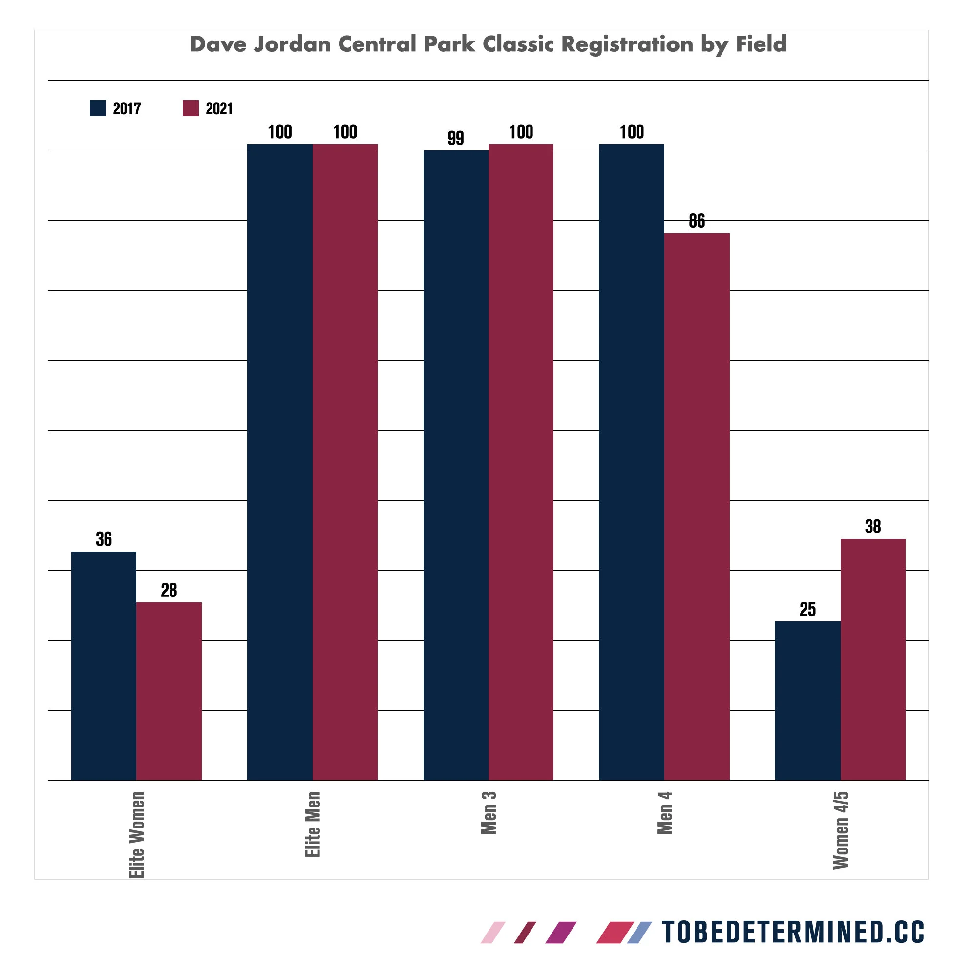 Thus in many ways the appropriate way to assess DJCPC registration is to compare 2017 and 2021, which is below on the right. This shows the Men’s fields all at sold out capacity, and significant growth in the Women’s 4/5 that more than offsets some slight shrink in the Elite Women’s field.